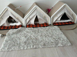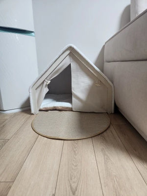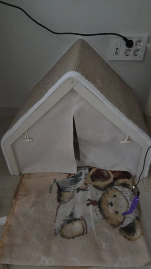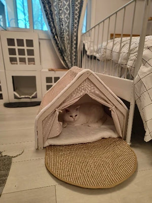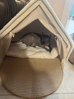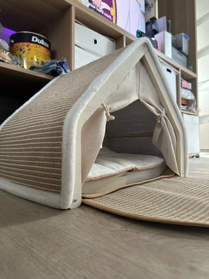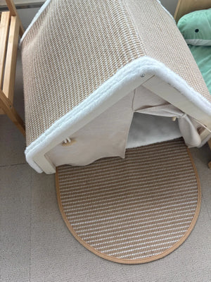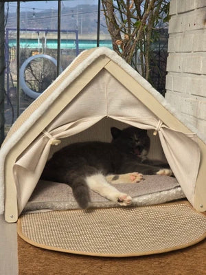 Warm, semi-enclosed cat villa that keeps cats snug and reduces home mess while blending with decor