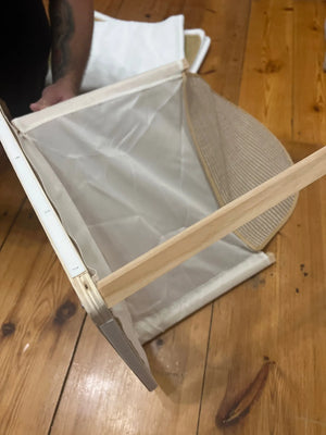 Cover removed easily for washing; wood frame feels sturdy and the whole thing doesn’t wobble.